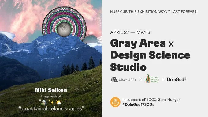May 2022: I curated the 'Terrine Perceptions’ exhibit on DoinGud, featuring 🏔 ✨ 🌤 #unattainablelandscapes. A portion of the proceeds go to support the United Nations Sustainable Development Goal of Zero Hunger. Collab with Gray Area and Design Science Studio